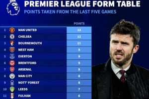 英超近5轮积分榜:曼联13分、切尔西12分,阿森纳、曼城各8分