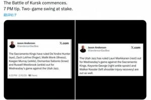 摆烂对决!明日爵士VS国王共9人缺阵 媒体人调侃:库尔斯克会战