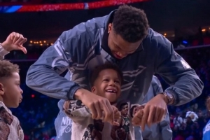 比赛中,伦纳德化身战胜卡,字母哥的儿子在场边竖起大拇指为伦纳德加油,作为世界队的一员,字母哥赶紧按下儿子的双手,并教他拇指向下嘘。