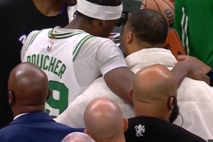GIF-布歇压哨扔进三分,威少不满差点冲突,随后双方解释互相友好退场