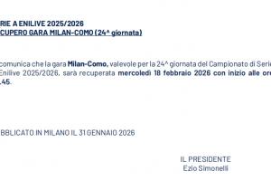意甲官方:AC米兰主场对阵科莫的补赛将在2月19日03:45进行
