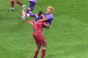 两名球员在球场边突然上演摔跤比赛,双方更是使出WWE摔跤动作,只见一方用“夺命剪刀脚”撂倒另一方,最后更是有球员上来扮演裁判为他们拍地板读秒!