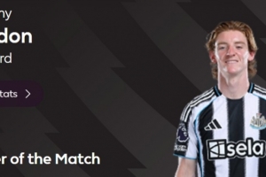 打进唯一进球,英超官方:戈登当选纽卡1-0切尔西全场最佳球员