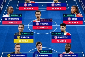 中场:恩梅查(5000万欧)、帕夫洛维奇(7500万欧)、扬·迪奥曼德(7500万欧)、穆西亚拉(1.2亿欧)、奥利塞(1.4亿欧)