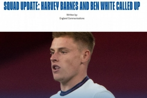 英格兰官方:埃泽、宽萨伤缺,巴恩斯入选、本·怀特时隔近4年回归
