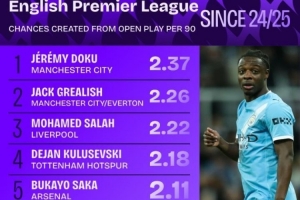 体育资讯2月3日讯 “Squawka”统计了上赛季开始至今,每90分钟创造运动战机会最多的前十位英超球员(只统计创造50次机会以上的球员)。曼城边锋多库以场均2.37次领跑榜单。