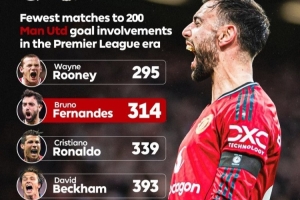 体育资讯2月8日讯 曼联在本轮英超2-0击败热刺,B费取得进球,也解锁了为曼联直接参与200球里程碑。数据统计显示,他也是英超时代第二快达成此成就的曼联球员。